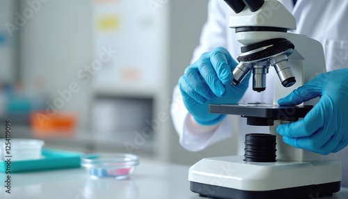 Lab worker examines sample under microscope. Scientist in gloves conducts medical research at hospital lab. Pharmaceutical tech analyzes virus specimen in clinic.