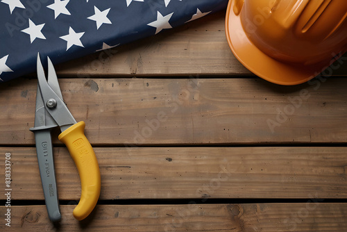labor, labour day, helmet, work tool, happy, celebration, composition, topview, lettering, national, improvement, freedom, abstract, national flag, concept, holiday, silk, tool, occupation, us, trendy, flag, equipment, working, event, photograph, hand-made, american flag, service, copy space, yellow, realistic, home, work, construction, instrument, repair, design, workshop, construct, white background, premium, office, industry, safety
