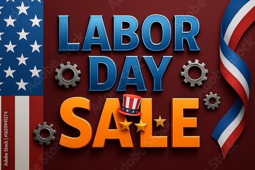 labour day, sale, graphic, three-dimensional, text, gear, patriotic, element, design, american, flag, celebration, holiday, us, red, white, blue, september, work, men at work, retail, discount, shopping, event, promotion, special, offer, banner, poster, digital, technology, industrial, cogwheel, gear, cog, symbol, national, country, pride, patriotism, freedom, illustration, metallic, steel, modern, typography, background, icon, concept