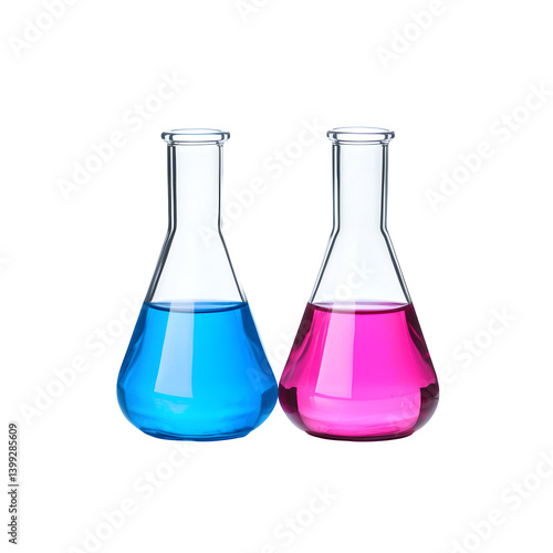 Laboratory beakers with blue and pink liquids isolated on white background