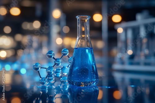 Laboratory equipment displays blue liquid in flask alongside molecular model, illustrating scientific research in a modern lab