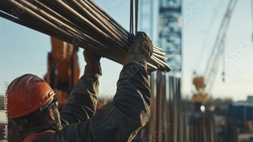 Laborer lifting steel rods at a construction site. Featuring strength and efficiency