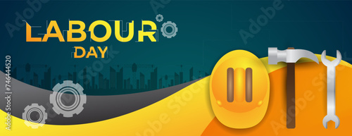 labour day banner design with helmet, tools and a city. vector illustration