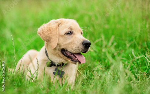 Labrador puppy posing for the camera in the green park