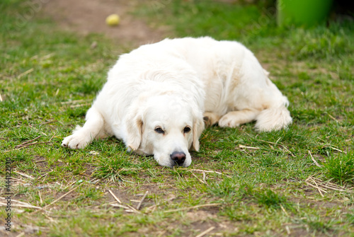labrodor, retriever white dog lying down in the grass and looking forward