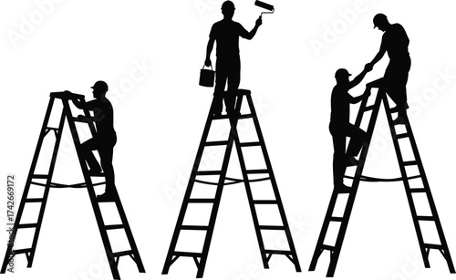 ladder, men at work, silhouette, painting, teamwork, safety, construction, climb, support, labor, vector, task, black, outline, job
