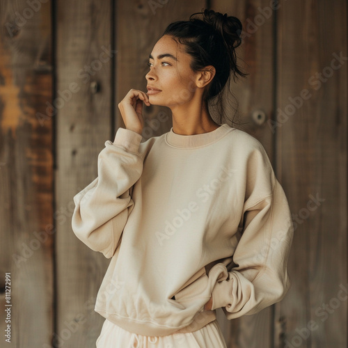 lady wearing sweatshirt, in the style of light beige and beige, rustic simplicity