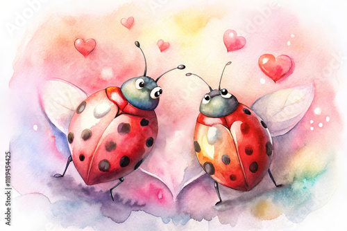 Ladybug Couple's Sweet Valentine - Two cute ladybugs, symbols of love, affection, spring, happiness, and Valentine's Day, share a tender moment amidst hearts.