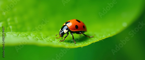 Ladybug crawling on green leaf in natural environment