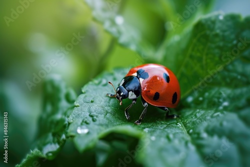 Ladybug, red with black dots green plant leaf. A beautiful brightly colored insect crawling on a bush leaf on a sunny day.