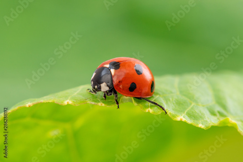 Ladybug runs on a green leaf