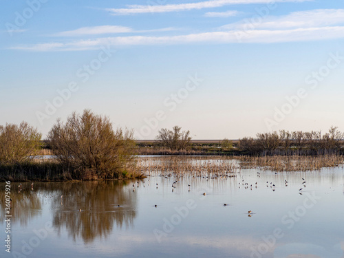 laguna en primavera con agua y aves parque natural de doñana en huelva.