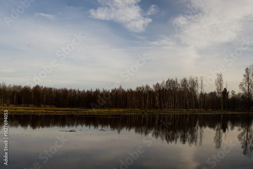 Lake and birch trees landscape, autumn reflections
