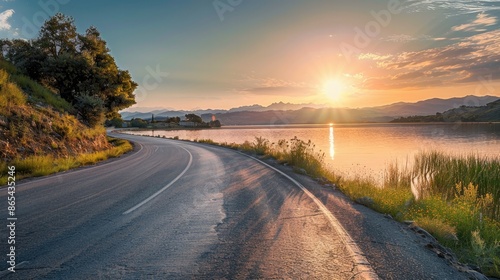 highway, horizon, sunrise, traffic, transport, transportation, sunlight, asphalt, empty, cloud, lake, nature, nobody, road, sky, sunset, water, background, landscape, street, summer, travel, drive, ground, journey, coast, sea, panorama, perspective, scenery, speed, trip, way, light, ocean, scenic, sun, blue, car, country, countryside, mountain, natural, river, tree, tour tourism, building, climate, cloudscape