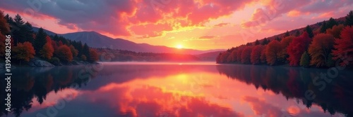 Lake at sunset, vibrant fall colors mirrored in still water , still, photo, serene