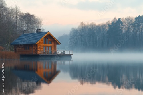 Lake cabin surrounded by morning mist and soft sunlight