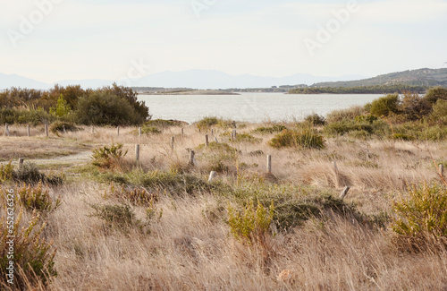 Lake landscape with mountains at sunrise. Lake of Leucate, Languedoc-Roussillon, France. between the departments of Pyrénées-Orientales and Aude in Occitania.Regional natural park of Narbonnaise.