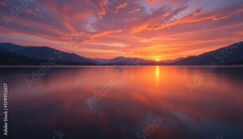 Lake Reflecting Fiery Sunset with Mountains in the Distance Scenery