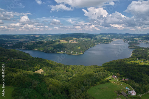 Lake Rożnowskie near Nowy Sącz in Małopolska (artificial reservoir), cumulus clouds, greenery - drone photo