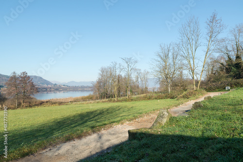 Lake with dirt bike path in winter. Comabbio lake, northern Italy. In the background the town of Comabbio