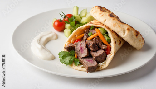 gyro, lamb, grilled meat, enclosed, homemade, epicure, traditional, lunch, dinner, accessing, fresh, warm, closeup, overhead, selective focus, natural light, food photography, healthy, organic, herb, vegetable, cucumber, tomatoes, tzatziki, bar-b-q, picnic, appetising, delicious, mouth-watering, menu, advertising, eatery, chef, epicure, copy space, horizontal, hi-res