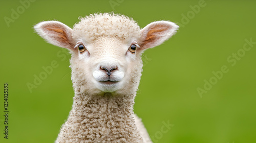 Lamb portrait, green pasture background, springtime, farm animal