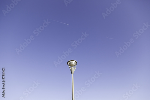 sky, blue, background, street light, aeroplane, city, street, lamp, lamp-post, urban, plane, white, light, bright, trail, architecture, shiny, glasses, metal, equipment, europa, shadow, electric, lantern, pattern, business, texture, travel, object, street light, isolated, design, high, post, france, backlit, wire, plugged, black, technology, day, silhouette, view, building, office, sun, vacation