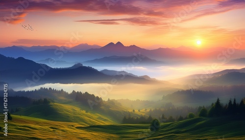 landscape background with sunrise over misty mountains dramatic sky rolling hills and serene nature scene at twilight