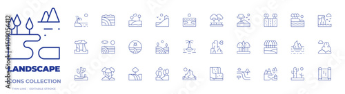 Landscape icons collection. Thin Line icons, editable stroke. desert, megalith, beach, field, forest, meadow, farm, hill, glacier, island, tree, waterfall