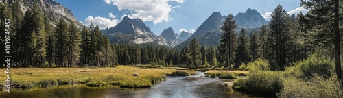 Landscape image of a peaceful mountain valley with a meandering river, surrounded by dense forests and towering peaks in the distance