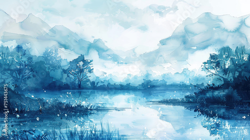 landscape in Cerulean Blue watercolor style
