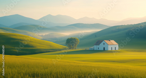 landscape, field, nature, sky, grass, house, mountain, meadow, green, farm, rural, summer, countryside, hill, tree, country, building, cloud, barn, mountain, home, agriculture, spring, view, old