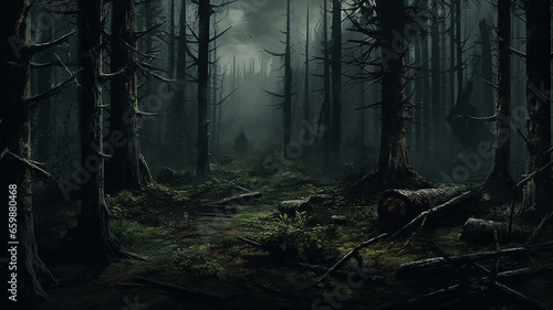 landscape mystical white fog in the autumn depressive forest, sadness loneliness mood