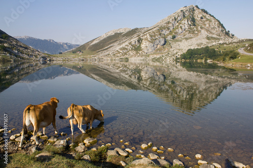 Landscape of a cows drinking water from a lake with mountains and reflection, in Lago Enol of Covadonga, Asturias, Spain.