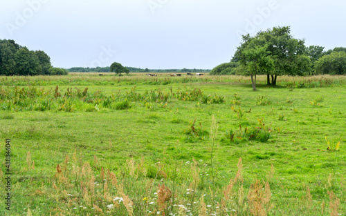 Landscape of Biebrza National Park, wetland, meadows, summer, clowdy sky. Podlaskie Voivodeship, Poland.