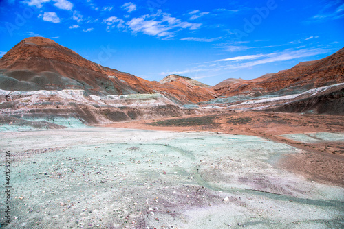 Landscape of colorful mountains with blue sky.