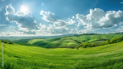 Landscape of rolling hills, picturesque countryside with green fields and scenic meadows, rural farmland in a sunny summer morning.