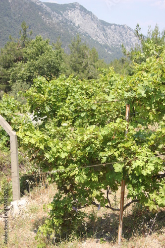 Landscape of rows in the vineyard in Izmir, Turkey. Juicy grapes in the garden.