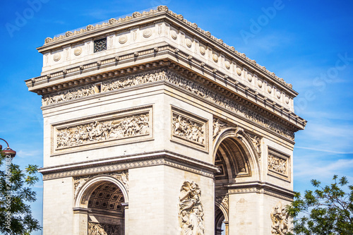 Landscape of the beautiful and monumental Arc de Triomphe on the Place of the General De Gaulle in Paris during a beautiful sunny summer day - Paris, France