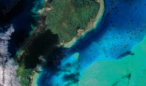 Landscape of the coast of the resort island of Bora Bora from a bird's eye view