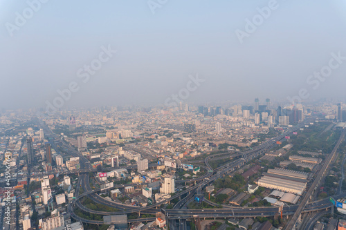 Landscape of the top view Bangkok metropolis Thailand with the dirty clouds air pollution problem. the tower and building with road line in business area