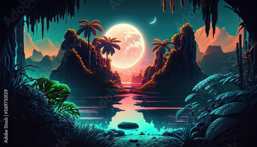 Landscape of tropical nature background illustration. Retro tone color style. Generative AI