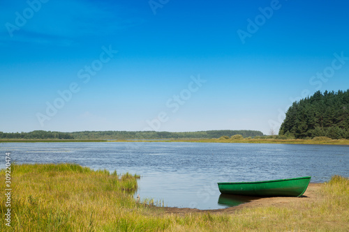 Landscape on the River Pra with green boat, Russia, nature reserve Meschera