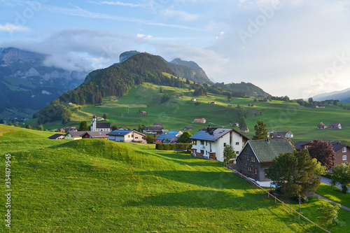 Landscape panorama of green nature and village houses near Appenzell, Alpstein mountains, Switzerland. Taken in June, in summer.