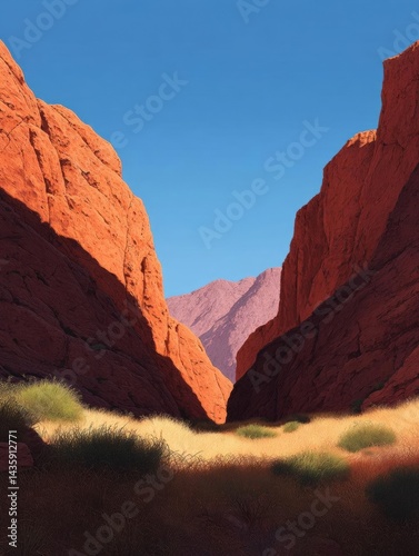 Landscape photograph of a desert-like area with red rock formations on either side. the sky is clear and blue, and the mountains in the background are visible in the distance.