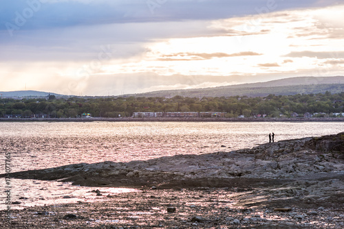 Landscape view of Ile D'Orleans, Quebec, Canada beach with couple during sunset with sun rays, large stormy clouds and Saint Lawrence river