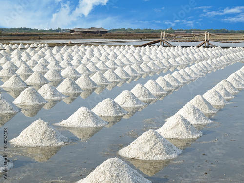 Landscape view of pile of salt in the salt pan at rural area of Thailand.