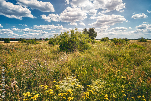landscape, summer, meadow, natural, nature, tree, bush, sky, blue, cloud, cloudscape, perspective, wide, far, berlin, house, skyline, flower, yellow, white, blossom, freedom, tranquil, idylli, sunbeam, city