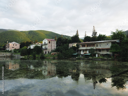 Landscape with a small mountain pond with houses among hills