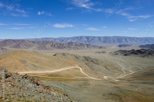 altai, mongolia, area, arid, asia, barren, blue, clear, desolate, dirt, landscape, massif, mongol, mongolian, mountain chain, mountain, nature, peak, perspective, region, remote, road, scenery, sky, tour tourism, travel, vale, view, viewpoint